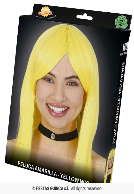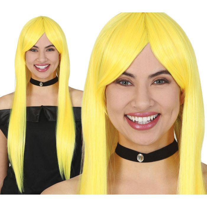 Dlhá čiernovlasá parochňa s bielymi prameňmi.