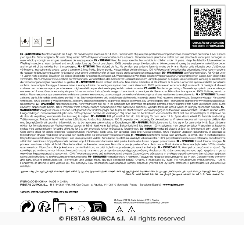 Licenčné kombinéza s poťahmi na topánky. Súčasťou je aj maska. Rozmery M / L dĺžka od ramena po pätu 117/135, hruď 76/102, rukáv 39/55, rozkrok - dĺžka po priehlavok 52/57 cm.