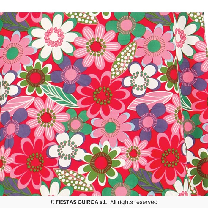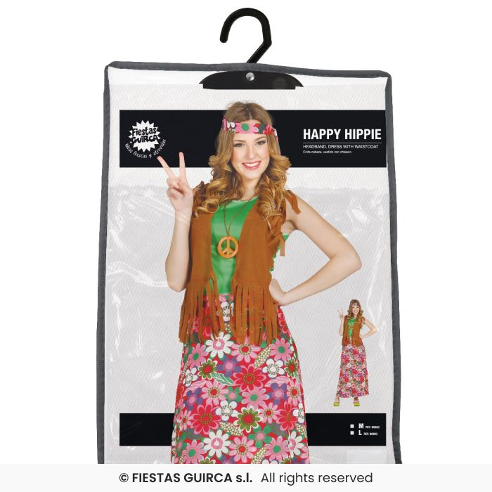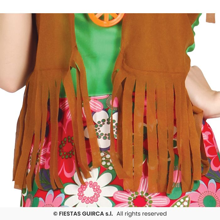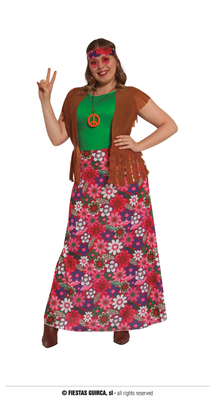 Štýlové hippie šaty s kvetinovou potlačou a zvonovými rukávmi. Stužka do vlasov je súčasťou kostýmu. Rozmery: dĺžka 88cm, hruď 94cm, rukáv 62cm, pas 90cm.
