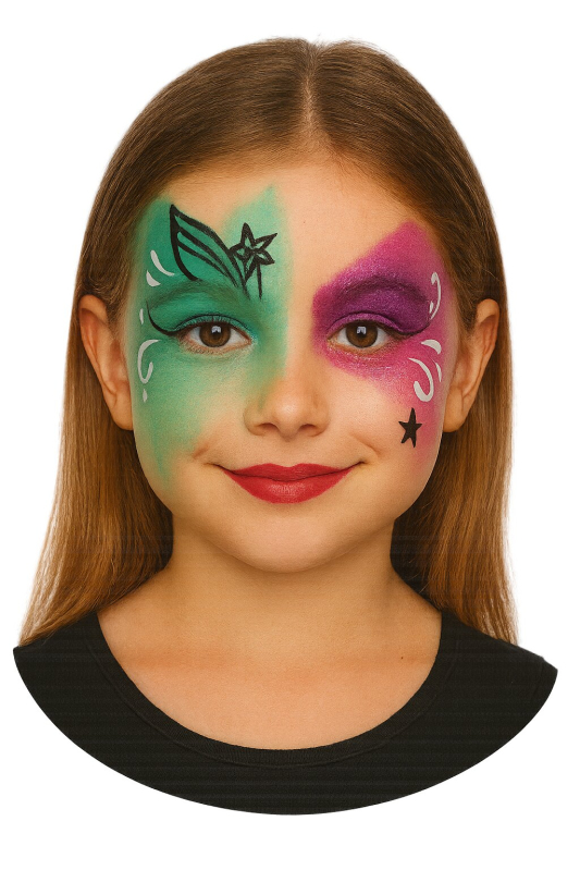 Detský set. Suché farby rozpustné vodou. Vystačí na 15 - 20 masiek. Vhodné pre maľovanie na tvár. Dermatologicky testované. Vyrobené vo SRN.