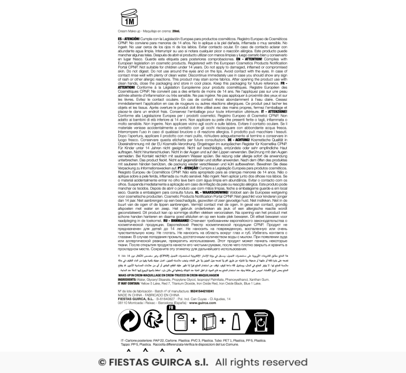 Líčidlo na báze tuku. Ľahko umývateľné teplou vodou a mydlom. Po otvorení je nutné spotrebovať do 6 mesiacov. Líčidlo sa nanáša prstom alebo priloženou hubkou. Nepoužívať na poranenú alebo extrémne citlivú pokožku. Obsah 9 gr.