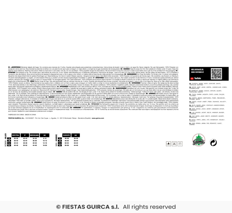 Kostým sa skladá z nohavíc, košele a čiapky. Materiál 100% polyester. Blúza - dĺžka od ramena 82, rukáv od krku 91, šírka 70 cm. Nohavice - celková dĺžka od ramena 133, pas do gumy 88 - 112 cm. Vzadu zips. Vhodné pre veľkosť M, L, XL.