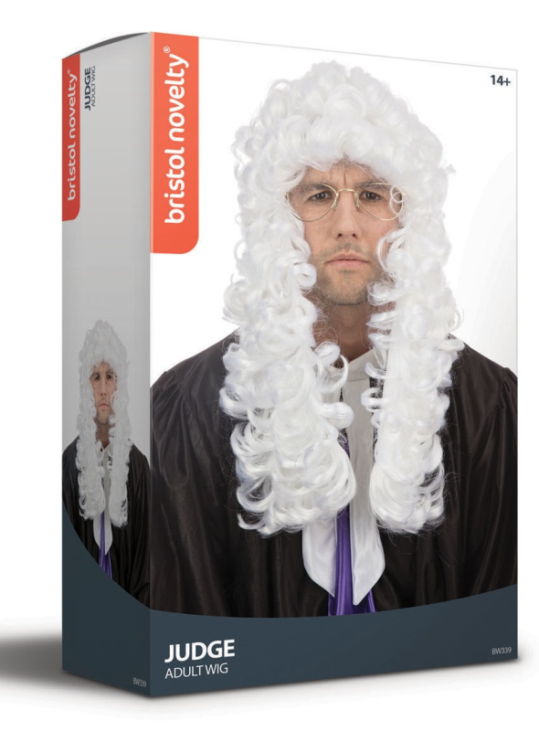 Bílá paruka na gumové podložce. Obočí a knír nejsou součástí paruky.