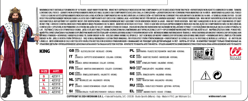 Kostým sa skladá z plášťa, pokrývky hlavy, pásu. 100% polyester. Vhodné pre veľkosť L, XL, XXL.